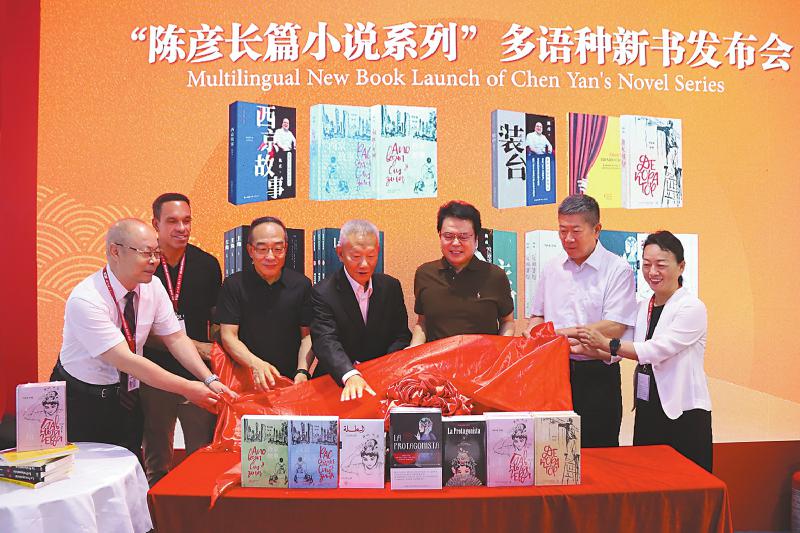 2025年6月19日,中国出版协会理事长邬书林(左四)、中国版权协会理事长阎晓宏(右二)、中国图书评论学会会长郭义强(左三)等出席“陈彦长篇小说系列”多语种新书发布会并为新书揭幕。